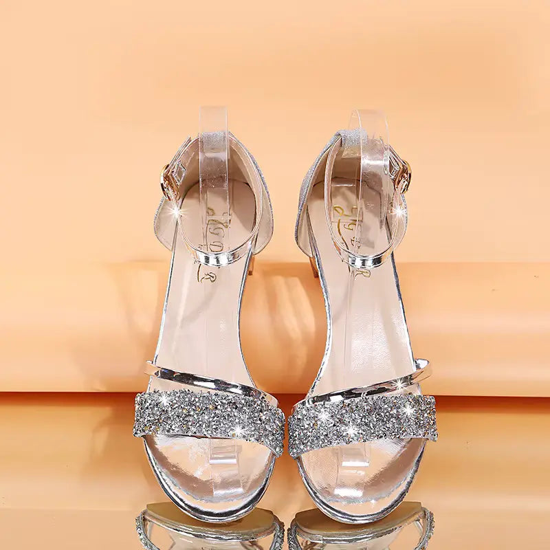 Silver high-heeled sandals with glittery straps on a reflective surface.